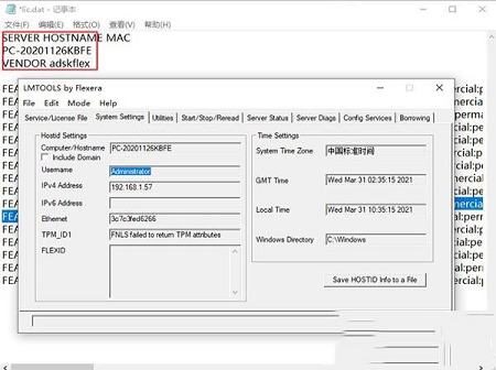 7、启动桌面许可服务,记事本方式打开lic.dat,更改HOSTNAME和MAC以适合您的配置,(启动LMTOOLS Utility-System Settings,即可找到你的HOSTNAME和MAC)
