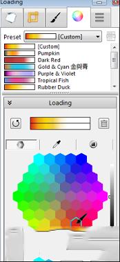 要蘸取颜色,请将画笔浸入色板中。用力按压,将颜色加载到笔毛中。使用不同的压力水平,您可以创建渐变的用色层次。当前蘸色显示在右侧有一个垃圾桶图标的条形中(见右图)。您可能要制作一个新的加载预设(按预设选择器右侧的图标,然后选择"添加",这将复制您当前的预设到一个新的预设),并使用新的预设进行实验,以便您可以保留以前的加载预设。如果确实想要返回原始预设,可以通过在预设菜单> 全套>恢复出厂设定中选择来执行重置。快速访问:"预设下拉列表"选择器的正下方是显示预设列表的快速访问面板。您可以通过热键- 在前10个预设中快速切换。您可以通过快速访问面板中的拖放来重新排序预设。
